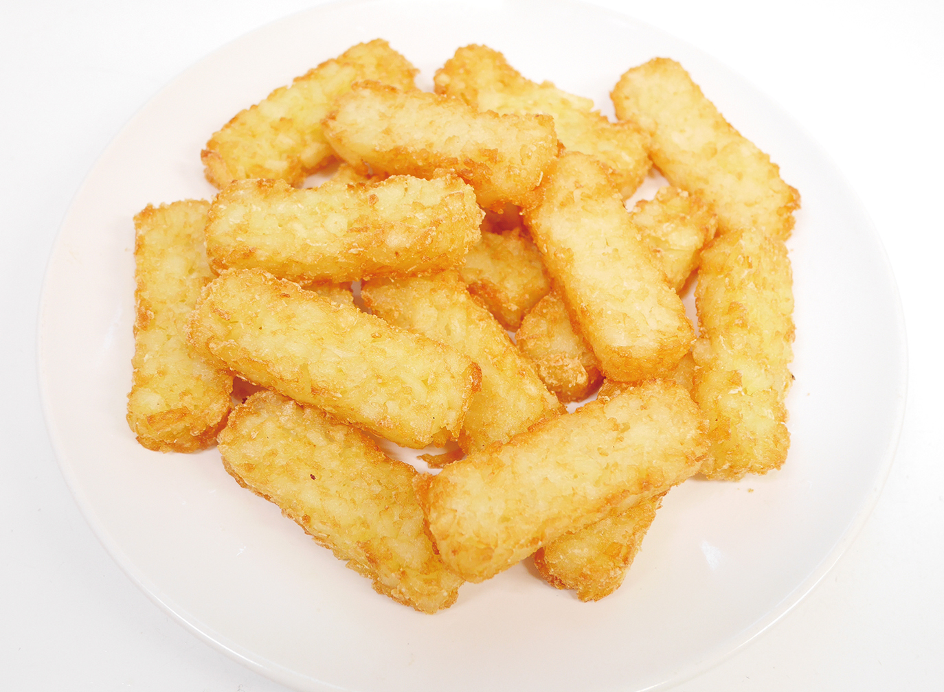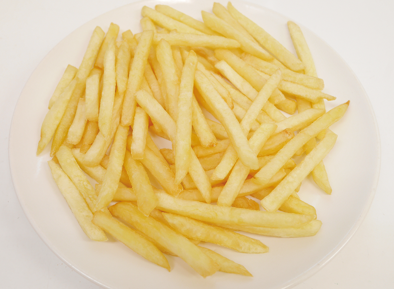 - じゃがいもを長さ約3cm以上のシューストリングカットにし、油で揚げて急速凍結しました。 凍ったまま約170~180℃の油で約3~4分油調するだけで簡単に調理できます!