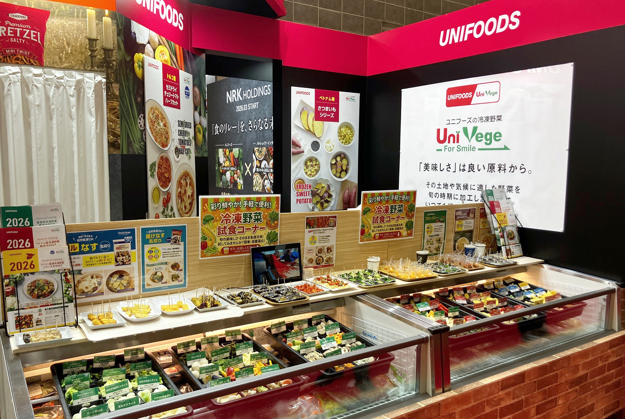 今回、グループ会社の(株)ノルレェイク・インターナショナルと合同出展し、世界の美味しい冷凍野菜・冷凍食品を展示、試食提案致しました。