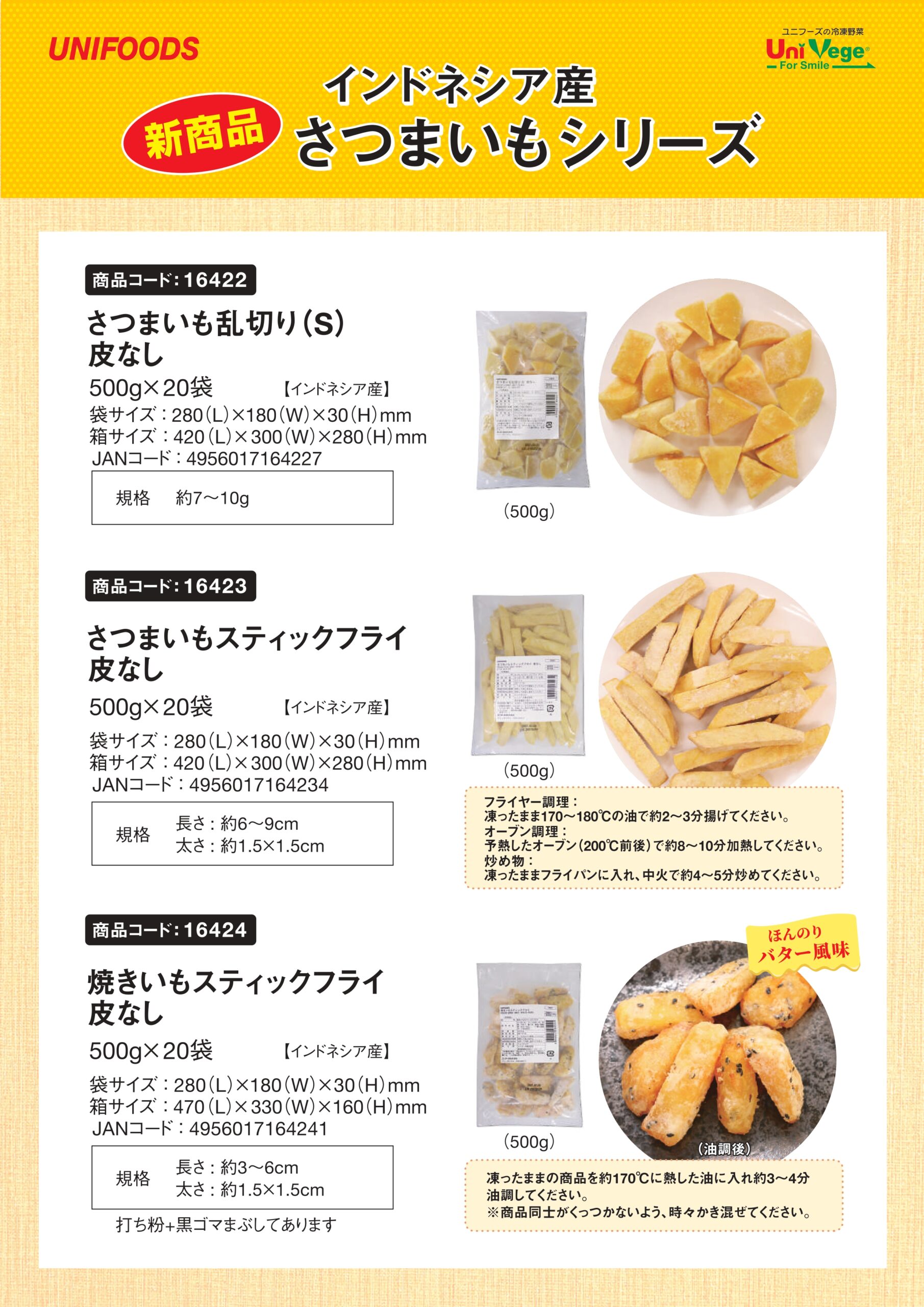 インドネシア産のさつまいもの皮をむき、約7~10gの乱切りにしました。 皮むき&カット済みなので、簡単・時短調理。 大学芋や炒め物などにおすすめです。