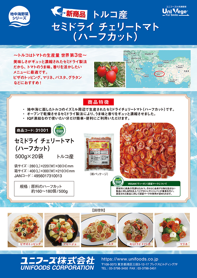 地中海に面したトルコのイズミル周辺で生産されたセミドライチェリートマト(ハーフカット)です。 オーブンで乾燥させるセミドライ製法により、うま味と香りをギュッと濃縮させました。 ピザのトッピング、アヒージョ、パスタ、マリネ、煮物など幅広くご使用いただけます。